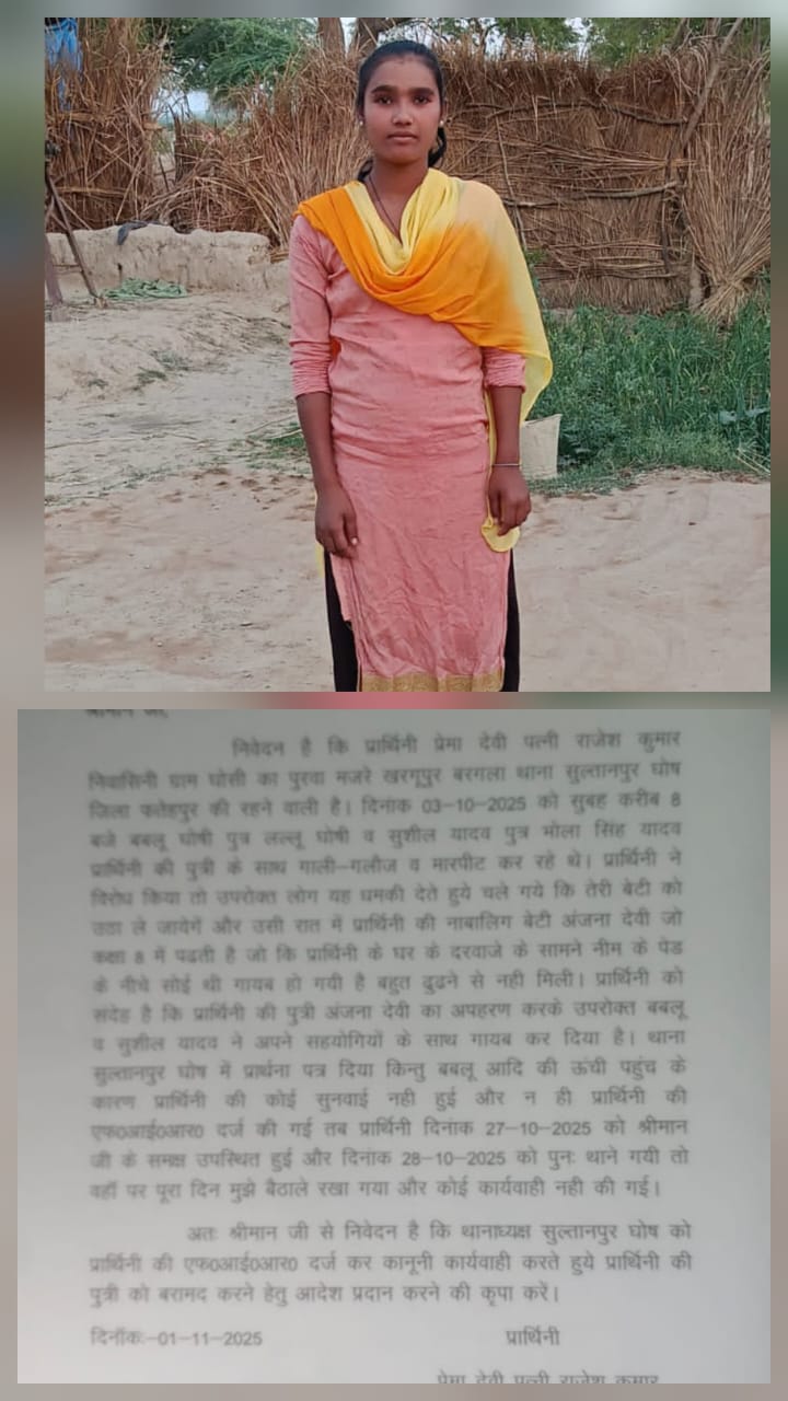 पीड़िता का कहना है कि उसने 9 अक्टूबर 2025 को भी थाना सुल्तानपुर घोष में प्रार्थना पत्र दिया था, पर अब तक न तो एफआईआर दर्ज हुई और न ही कोई कार्रवाई की गई। उन्होंने कहा कि जब वह न्याय की गुहार लगाने गईं तो आरोपियों ने फिर धमकी दी कि “अगर ज्यादा आवाज उठाई तो बाकी बेटियों को भी गायब कर देंगे।”