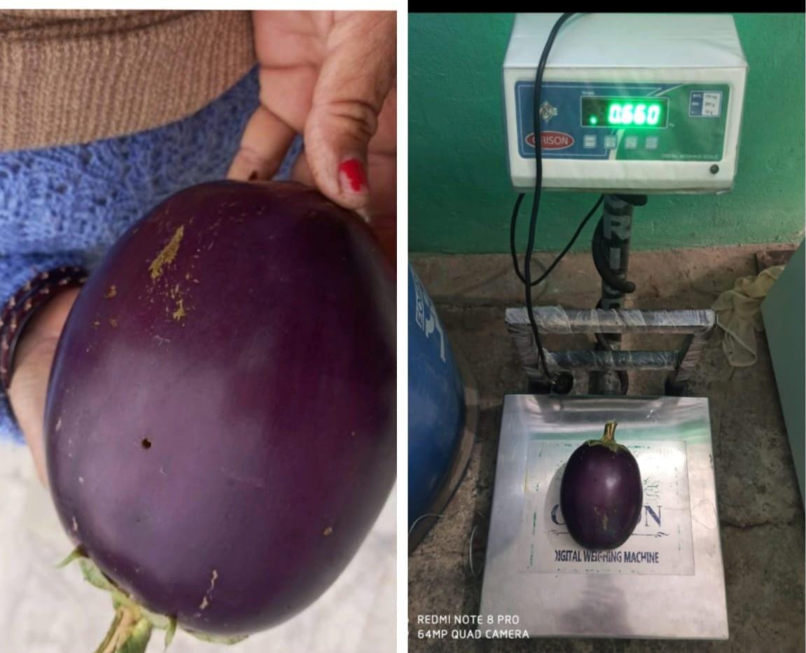ग्रामीणों के अनुसार सहदेव दत्त शर्मा ने अपने खेत में अदरक के साथ-साथ बैंगन की फसल लगाई है। खास बात यह है कि बैंगन का वजन 600 से 660 ग्राम तक पहुंच रहा है, जो सामान्य बैंगन की तुलना में कहीं अधिक है। खेत में उगा यह विशालकाय बैंगन देखते ही देखते पूरे इलाके में चर्चा का विषय बन गया है।