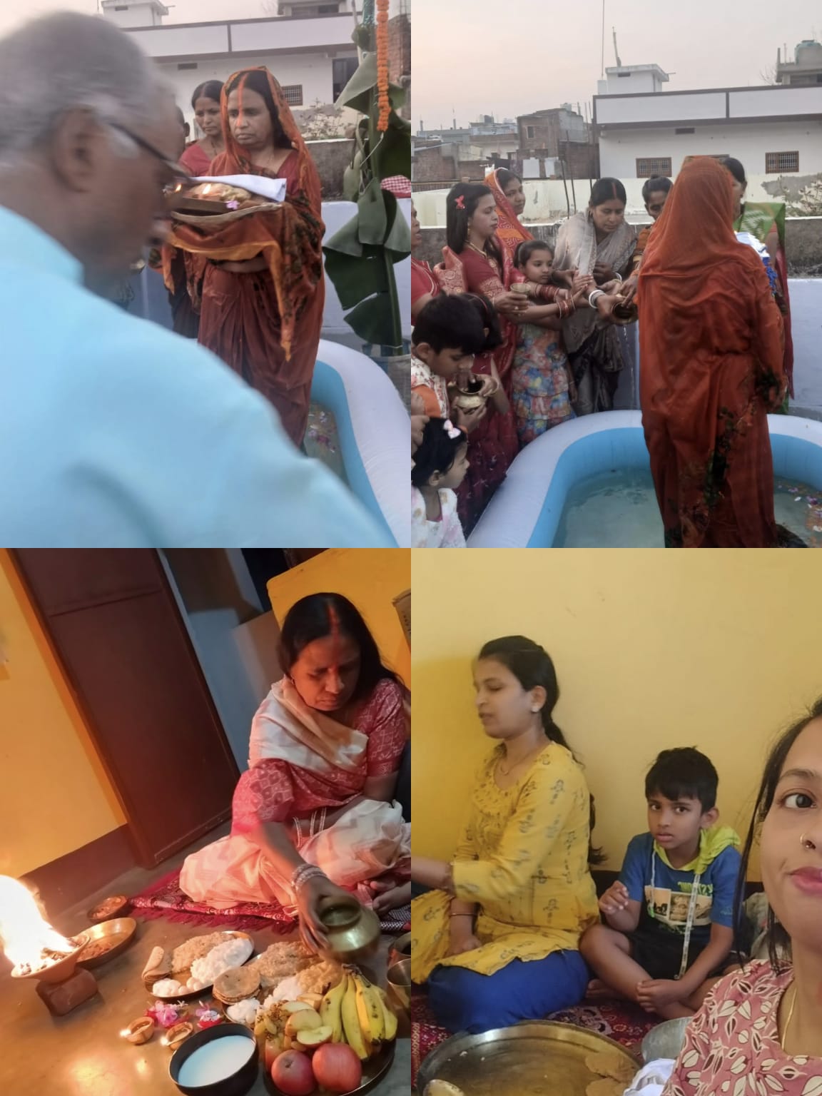 इस अवसर पर परिवार के अन्य परिजनों ने भी पूजा में सक्रिय रूप से भाग लिया। बच्चों और महिलाओं ने मिलकर पूजा की सभी तैयारियों में सहयोग किया। घर के आंगन में बनाए गए अस्थायी कुंड में जल भरकर व्रती महिलाओं ने उसमें खड़े होकर सूर्य देव को अर्घ्य अर्पित किया। इस दौरान आसपास की महिलाओं और बच्चों की मौजूदगी ने माहौल को और भी भक्तिमय बना दिया।
