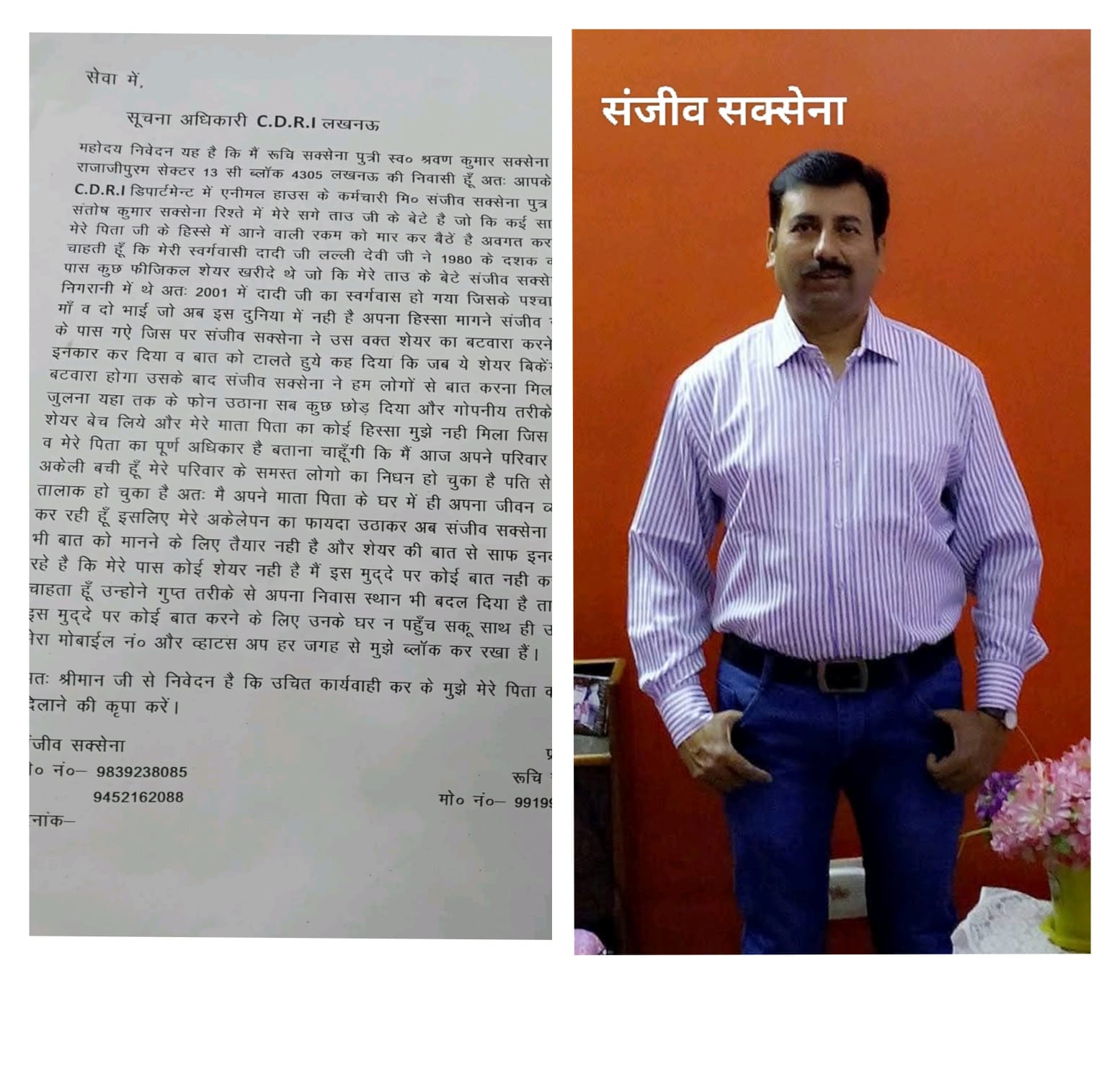 राजाजीपुरम, सेक्टर-13 सी-ब्लॉक निवासी रूचि सक्सेना, पुत्री स्वर्गीय श्रवण कुमार सक्सेना, ने बताया कि उनकी दादी लल्ली देवी ने 1980 के दशक में कुछ फिजिकल शेयर खरीदे थे। इन शेयरों की निगरानी परिवार के ही सदस्य संजीव सक्सेना, पुत्र स्वर्गीय संतोष कुमार सक्सेना, के पास थी, जो वर्तमान में CDRI लखनऊ के एनीमल हाउस विभाग में कर्मचारी हैं।