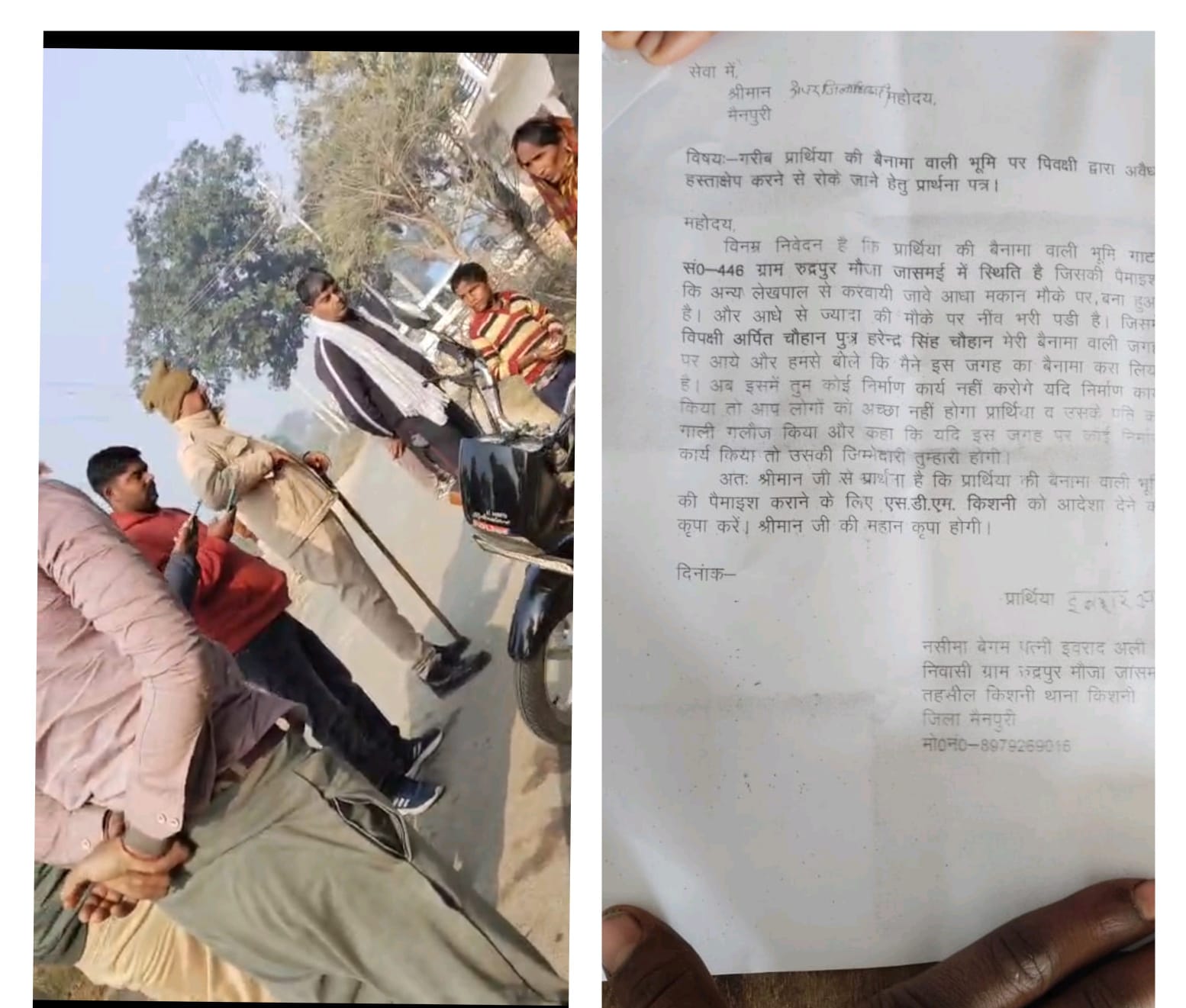 उत्तर प्रदेश के मैनपुरी जिले के किशनी तहसील अंतर्गत ग्राम रुद्रपुर मौजा जासमई में एक गरीब परिवार की बैनामा वाली भूमि पर अवैध हस्तक्षेप का गंभीर मामला सामने आया है। पीड़िता नसीमा बेगम ने आरोप लगाया है कि उनकी पुश्तैनी व बैनामा की जमीन पर दबंग किस्म के व्यक्ति द्वारा जबरन कब्जा करने और निर्माण कार्य रोकने की धमकियां दी जा रही हैं, जिससे पूरा परिवार भय और मानसिक उत्पीड़न में जीने को मजबूर है।