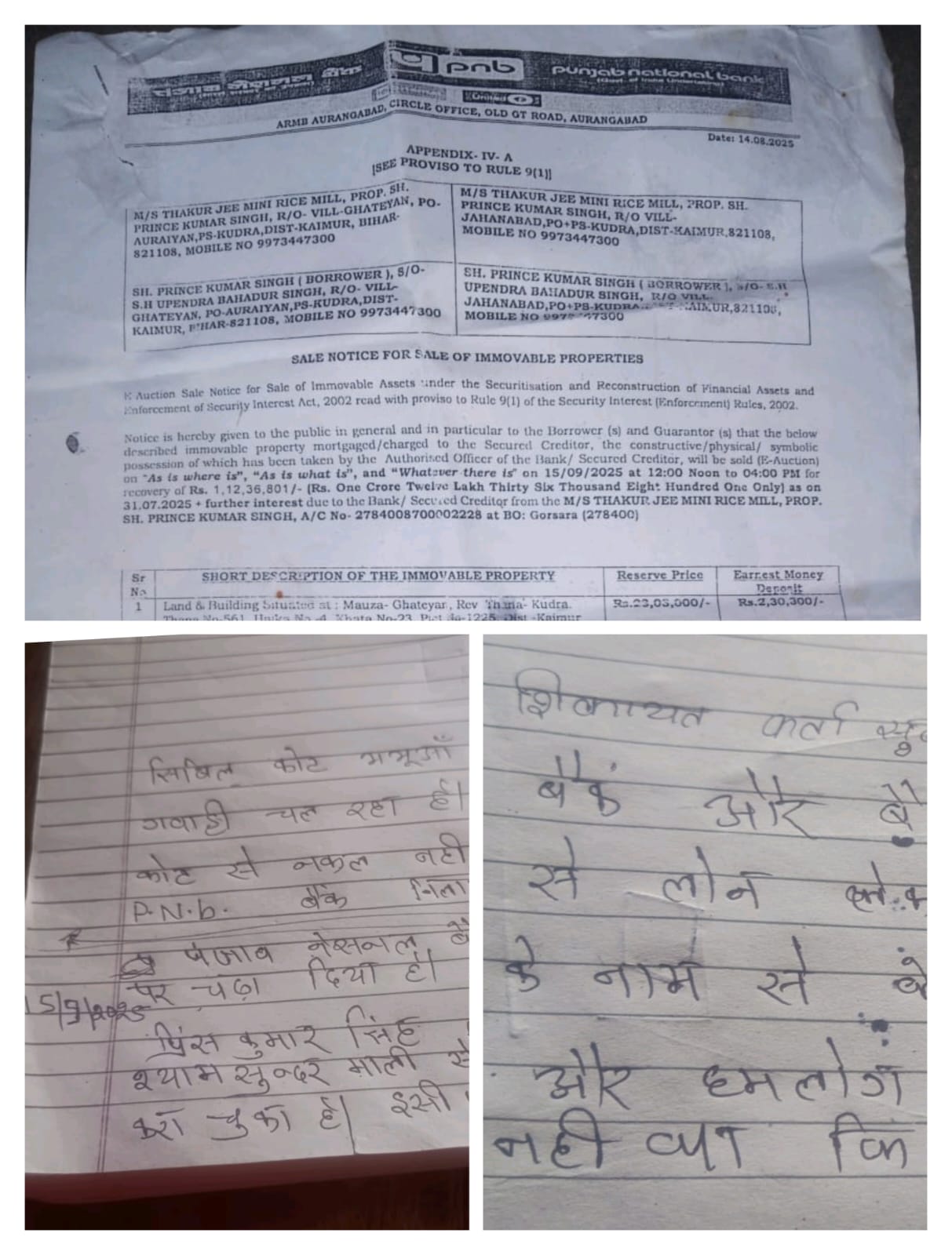 बैंक द्वारा जारी नोटिस में बताया गया है कि M/S ठाकुर जी मिनी राइस मिल, प्रो. प्रिंस कुमार सिंह निवासी घटेयान, थाना कुदरा, जिला कैमूर ने करोड़ों का कर्ज लिया था और अदायगी न करने पर उनकी तीन संपत्तियों की ई-नीलामी 15 सितंबर 2025 को निर्धारित की गई है।