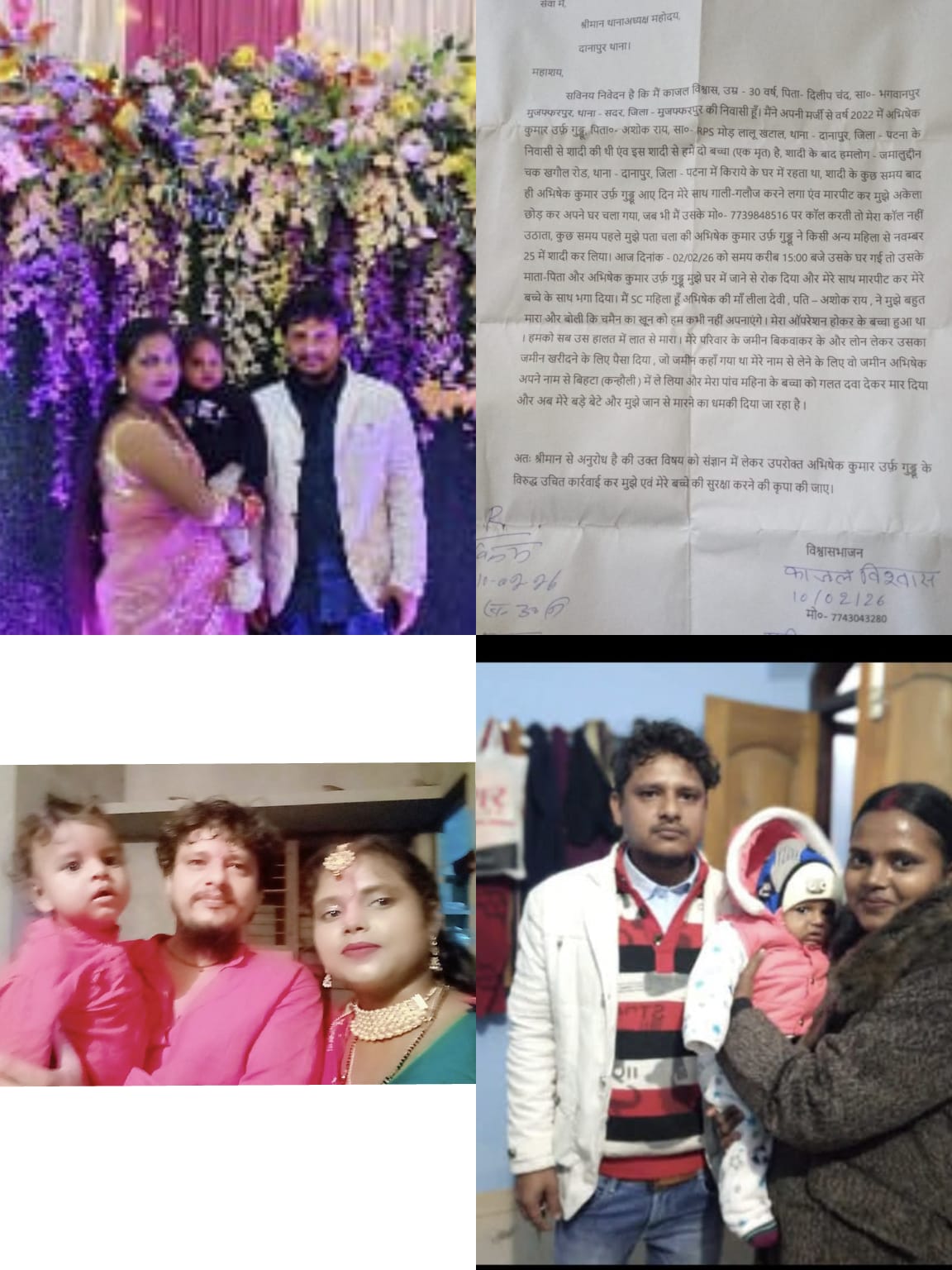 दानापुर/पटना। दानापुर थाना क्षेत्र में एक विवाहिता ने अपने पति और ससुराल पक्ष पर मारपीट, धोखाधड़ी, दूसरी शादी और जान से मारने की धमकी जैसे गंभीर आरोप लगाए हैं। पीड़िता काजल विश्वास (उम्र 30 वर्ष), निवासी भगवानपुर, मुजफ्फरपुर, का कहना है कि उसने वर्ष 2022 में अपनी मर्जी से अभिषेक कुमार उर्फ गुड्डू, निवासी आरपीएस मोड़ लालू खटाल, थाना दानापुर, जिला पटना से प्रेम विवाह किया था। शादी के बाद दोनों खगौल रोड स्थित जमालुद्दीन चक इलाके में किराये के मकान में रहते थे।