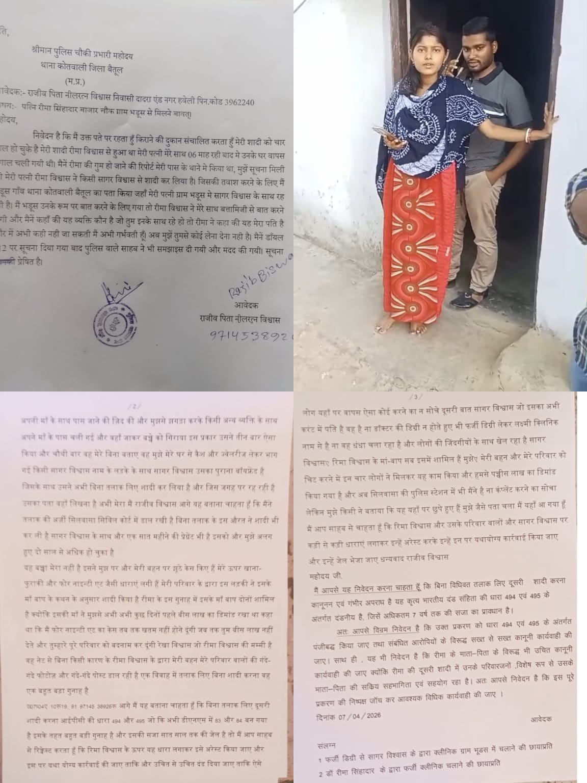 बैतूल। मध्यप्रदेश के बैतूल जिले में वैवाहिक विवाद का एक चौंकाने वाला मामला सामने आया है। दादरा एंड नगर हवेली निवासी एक युवक ने अपनी पत्नी पर उसे छोड़कर दूसरे युवक के साथ रहने का आरोप लगाते हुए पुलिस से शिकायत की है। युवक का कहना है कि शादी के कुछ समय बाद ही पत्नी उसे छोड़कर चली गई और अब बैतूल जिले के एक गांव में दूसरे व्यक्ति के साथ रह रही है।