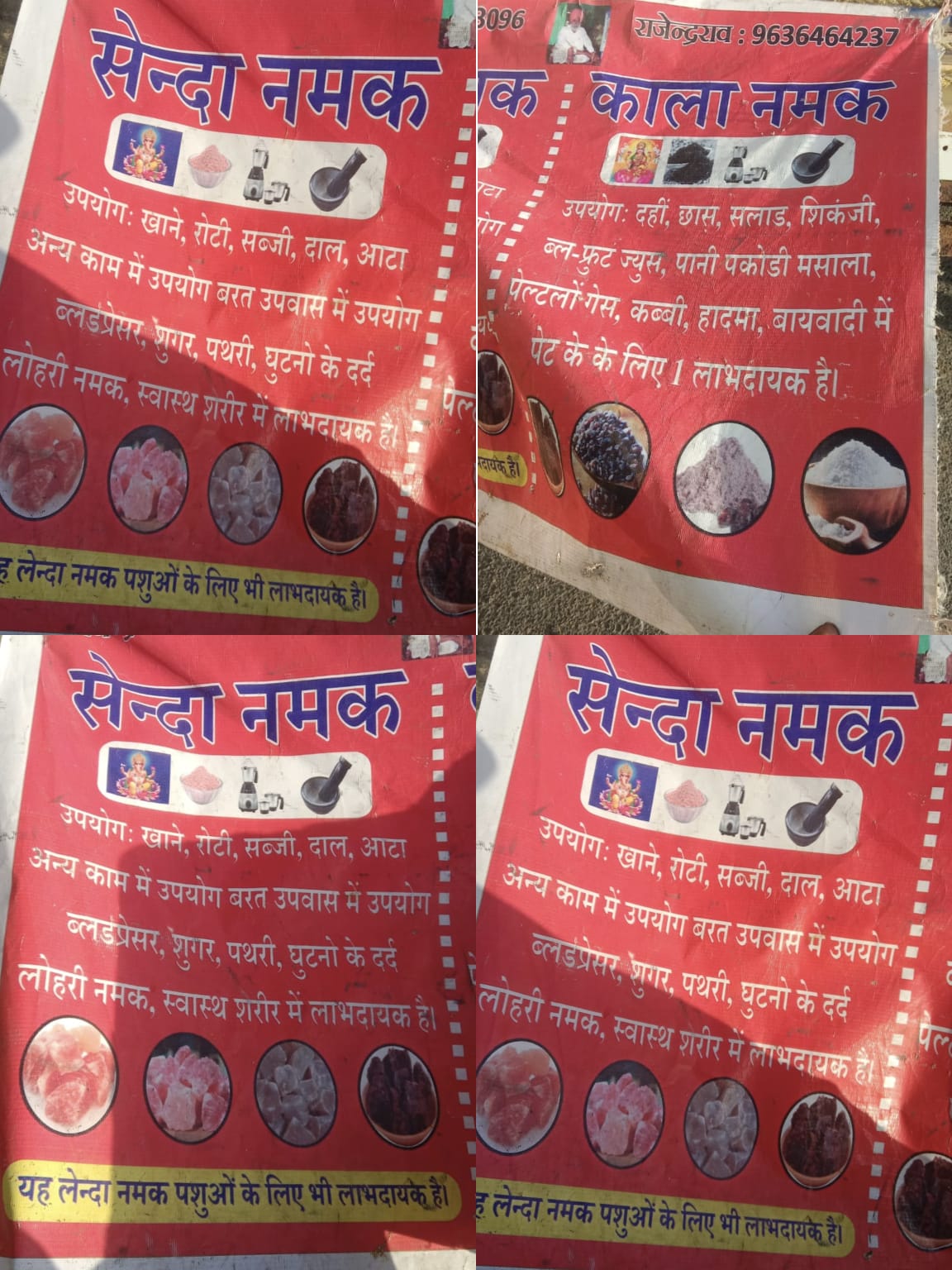 राजेंद्रराव, जिनका मोबाइल नंबर 9660703096 बताया गया है, राजस्थान के रहने वाले हैं और फिलहाल डमरू चौक में महादेव मंदिर के पास स्टार्ट क्लब रेस्टोरेंट और पेट्रोल पंप के आसपास अपना स्टॉल लगाकर नमक बेच रहे हैं। उनका कहना है कि शुद्ध सेंधा नमक और काला नमक दोनों ही पारंपरिक रूप से स्वास्थ्य के लिए लाभदायक माने जाते हैं और कई लोग आज भी इनका उपयोग अपने दैनिक भोजन और घरेलू नुस्खों में करते हैं।