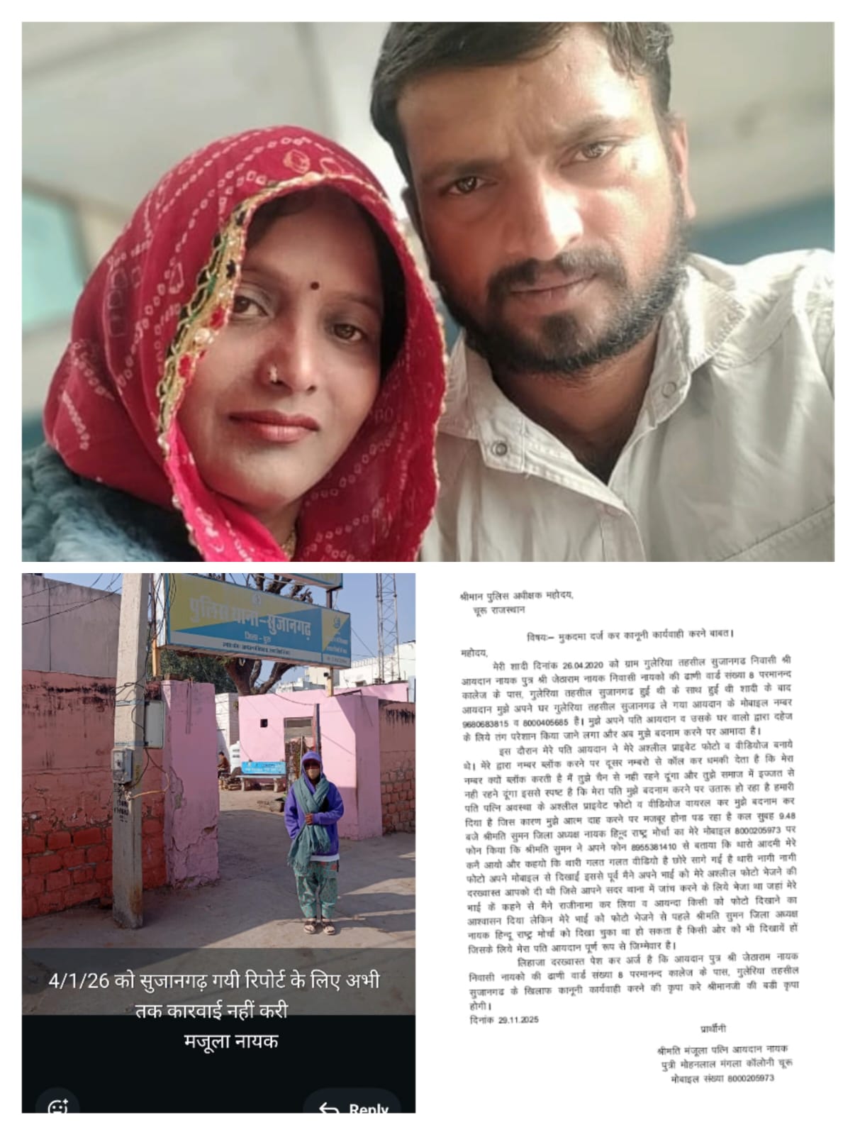 सुजानगढ़ क्षेत्र से एक गंभीर और चौंकाने वाला मामला सामने आया है, जहां एक विवाहिता ने अपने पति पर दहेज के लिए प्रताड़ित करने, अश्लील निजी फोटो और वीडियो बनाने तथा उन्हें समाज में वायरल कर बदनाम करने के गंभीर आरोप लगाए हैं। पीड़िता का कहना है कि इन हरकतों से वह मानसिक रूप से पूरी तरह टूट चुकी है और उसे आत्मदाह जैसे कदम के लिए मजबूर किया जा रहा है।