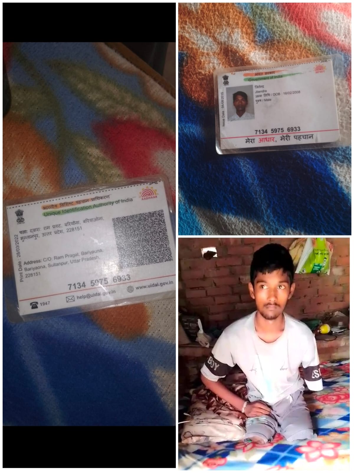राम प्रगति बारियाओना, सुल्तानपुर जिले के 17 वर्षीय जितेंद्र राम बेहद संवेदनशील स्थिति में हैं। उनके अनुसार, उनके दोनों पैर और एक हाथ कटे हुए हैं और वे वर्तमान में जीवन यापन के लिए गंभीर आर्थिक सहायता के मोहताज हैं।