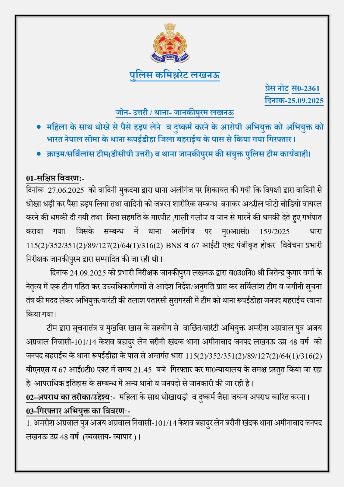 लखनऊ, 25 सितम्बर 2025: पुलिस कमिश्नरेट लखनऊ की उत्तरी जोन और थाना जानकीपुरम की संयुक्त टीम ने महिला के साथ धोखाधड़ी कर पैसा हड़पने और दुष्कर्म करने के आरोपी को भारत-नेपाल सीमा के पास बहराईच जिले के थाना रूपईडीहा से गिरफ्तार किया।