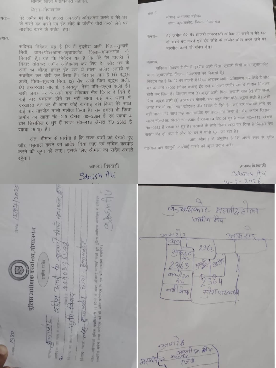 पीड़ित ने कुदुस अली, सैफ अली और इस्तरखार मोलबी सहित अन्य लोगों पर आरोप लगाते हुए बताया कि इन लोगों ने न केवल जमीन पर कब्जा किया बल्कि उनके घर के सामने दीवार खड़ी कर रास्ता भी पूरी तरह बंद कर दिया। इसके कारण अब उनके घर में पानी भरने की समस्या भी उत्पन्न हो गई है।