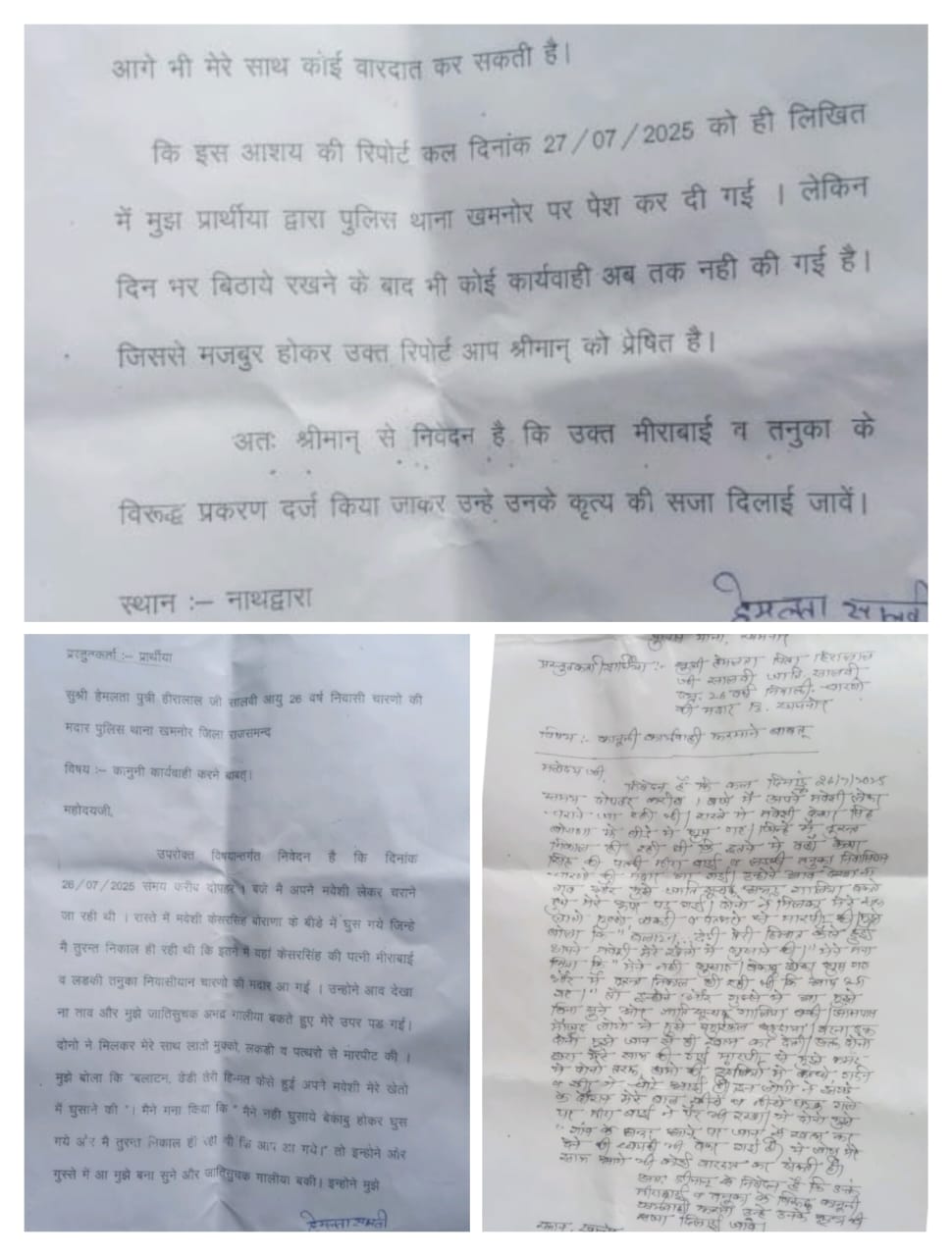 हेमलता ने बताया कि 27 जुलाई को उसने खमनोर थाना पुलिस को घटना की लिखित शिकायत दी थी, लेकिन कार्रवाई नहीं हुई। इसके बाद उसने पुलिस उप अधीक्षक नाथद्वारा को ज्ञापन सौंपते हुए आरोपियों पर प्रकरण दर्ज कर कार्रवाई की मांग की है।